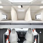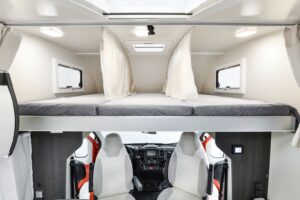 La pianta interna suddivisa con quattro posti letto a castello con ampio armadio nella parte centrale in coda, mentre anteriormente la mansarda con finestre e oblò, è in grado di ospitare tre posti letto separabili da tende. IN aggiunta il tavolo della dinette ha una gamba adattabile e trasformabile in zona notte per ospitare una persona in più. Ogni posto letto è dotato di faretto di lettura, presa USB e 220V.