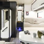 La dinette può ospitare 5 persone comodamente ed è completata da una cucina altrettanto confortevole: ampio piano d’appoggio, piano ad induzione da 1600 W, una presa da 220 V dedicata alla macchina da caffè alimentata dall’inverter e un maxi frigo Thetford a compressore da 152 litri. Il benessere a bordo è garantito anche dal condizionatore a tetto pratico e di facile utilizzo che mantiene la temperatura interna perfetta (marca DOMETIC FRESHJET 3200).